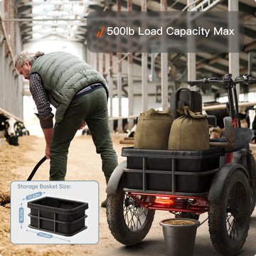 • Heavy-Duty Pickup-Class Tricycle: Built with durable aluminum alloy and a Golden Ratio chassis for stability, it supports 350–500 lbs. The rear-wheel differential ensures balanced turns, and hydraulic brakes offer reliable stopping power. Comes with a spacious rear basket (19.68" x 17.5" x 10.2") for groceries, gear, or cargo.
