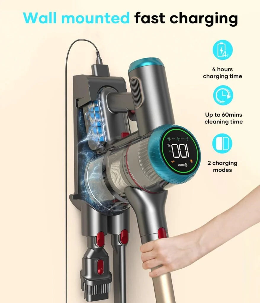 Up to 60 Minutes of Runtime: Equipped with a powerful 2500mAh 7-cell battery, the vacuum delivers up to 60 minutes of cleaning in Eco mode. It charges fully in just 4–5 hours using the included wall-mounted charging dock.