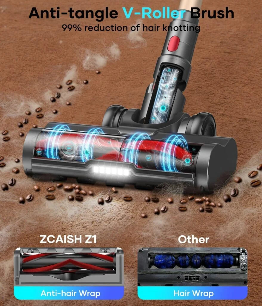LED-Equipped, V-Shaped Anti-Tangle Brush: The V-shaped roller brush resists tangling and glides smoothly across all surfaces. A 180° flexible head and built-in LED lights help you clean under furniture, along baseboards, and in dark corners—ideal for pet owners.